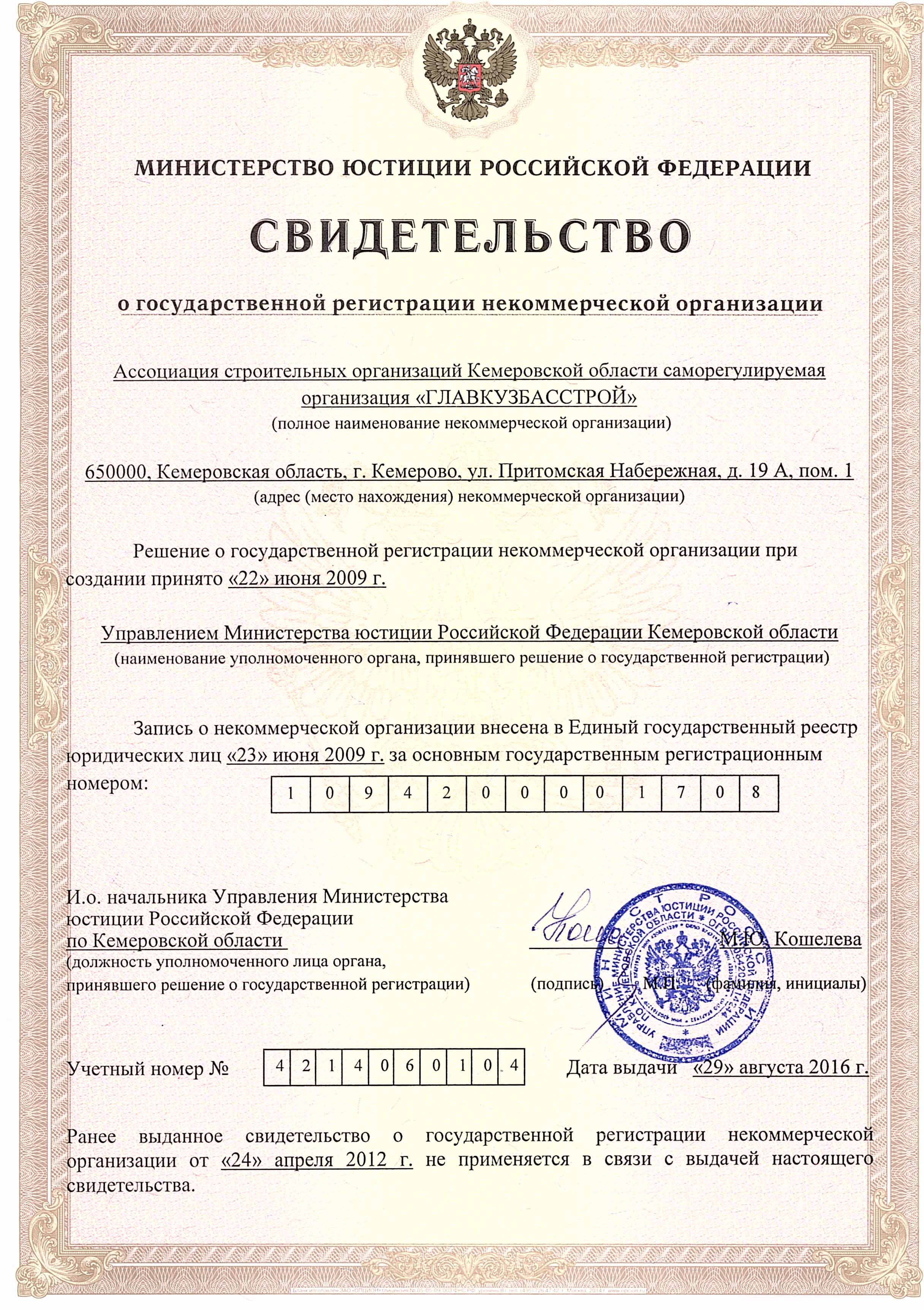 Наименование организации: Сокращенное наименование организации: ИНН/КПП: ОГРН: Юридический адрес: 650000, Российская Федерация, Кемеровская область, Телефоны: Дополнительные телефоны: Адрес электронной почты: info@npgks.ru Режим работы: Некоммерческое партнерство строительных организаций Кемеровской области «ГЛАВКУЗБАССТРОЙ» зарегистрировано 23.06.2009. Партнерство создано в целях содействия своим членам - лицам, осуществляющих деятельность в сфере строительства, в осуществлении строительной деятельности. Партнерство осуществляет саморегулирование строительной деятельности своих членов в порядке, предусмотренном Градостроительным Кодексом Российской Федерации, Федеральным законом «О саморегулируемых организациях». Статус саморегулируемой организации присвоен Партнерству 21.10.09, о чем внесена запись в Государственный реестр саморегулируемых организаций, основанных на членстве лиц, осуществляющих строительство, реконструкцию, капитальный ремонт объектов капитального строительства. Присвоен реестровый номер СРО-С-051-21102009. С 24 августа 2016 года полное наименование саморегулируемой организации: Ассоциация строительных организаций Кемеровской области саморегулируемая организация «ГЛАВКУЗБАССТРОЙ», сокращенное наименование: Ассоциация СРО «ГЛАВКУЗБАССТРОЙ».